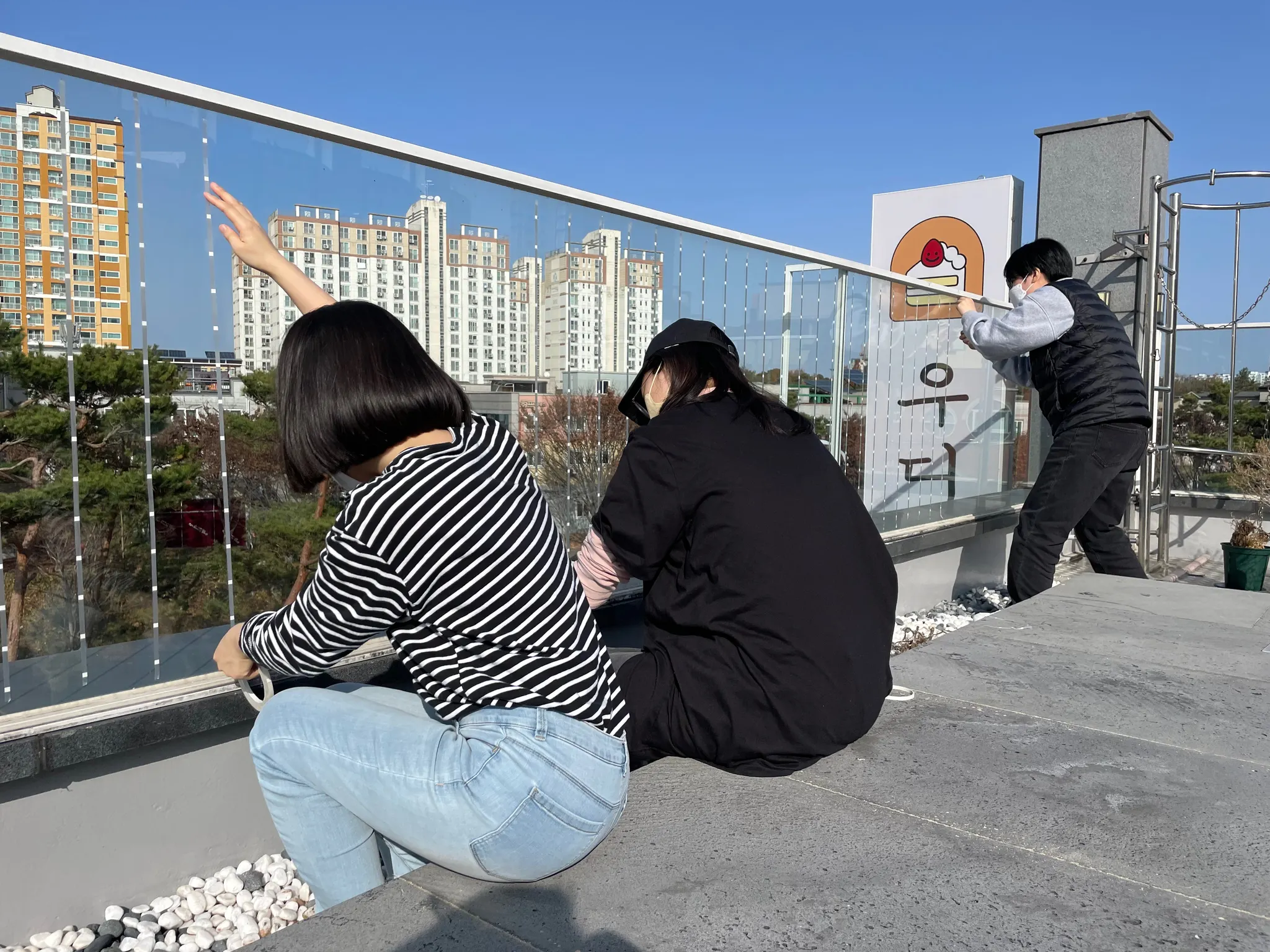 카페 우디너리 유리난간에 조류충돌 방지 테이프를 붙이는 시민 봉사자들 (사진=성난비건 제공)