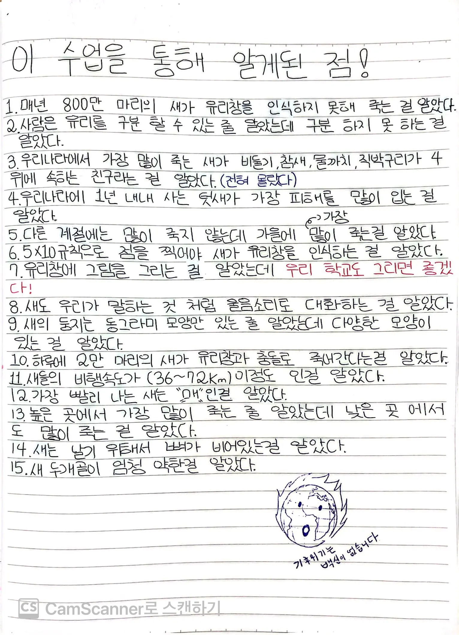 유리가 아주 많은 높은 빌딩보다 주변 숲, 공원등이 많은 3층이하 혹은 4층~10층 높이의 건물에 많이 부딪쳐 죽는다는 것을 보며 새들이 많이 서식하는 곳에 있는 건물이 더 위험하다는 것도 알게 되었습니다.